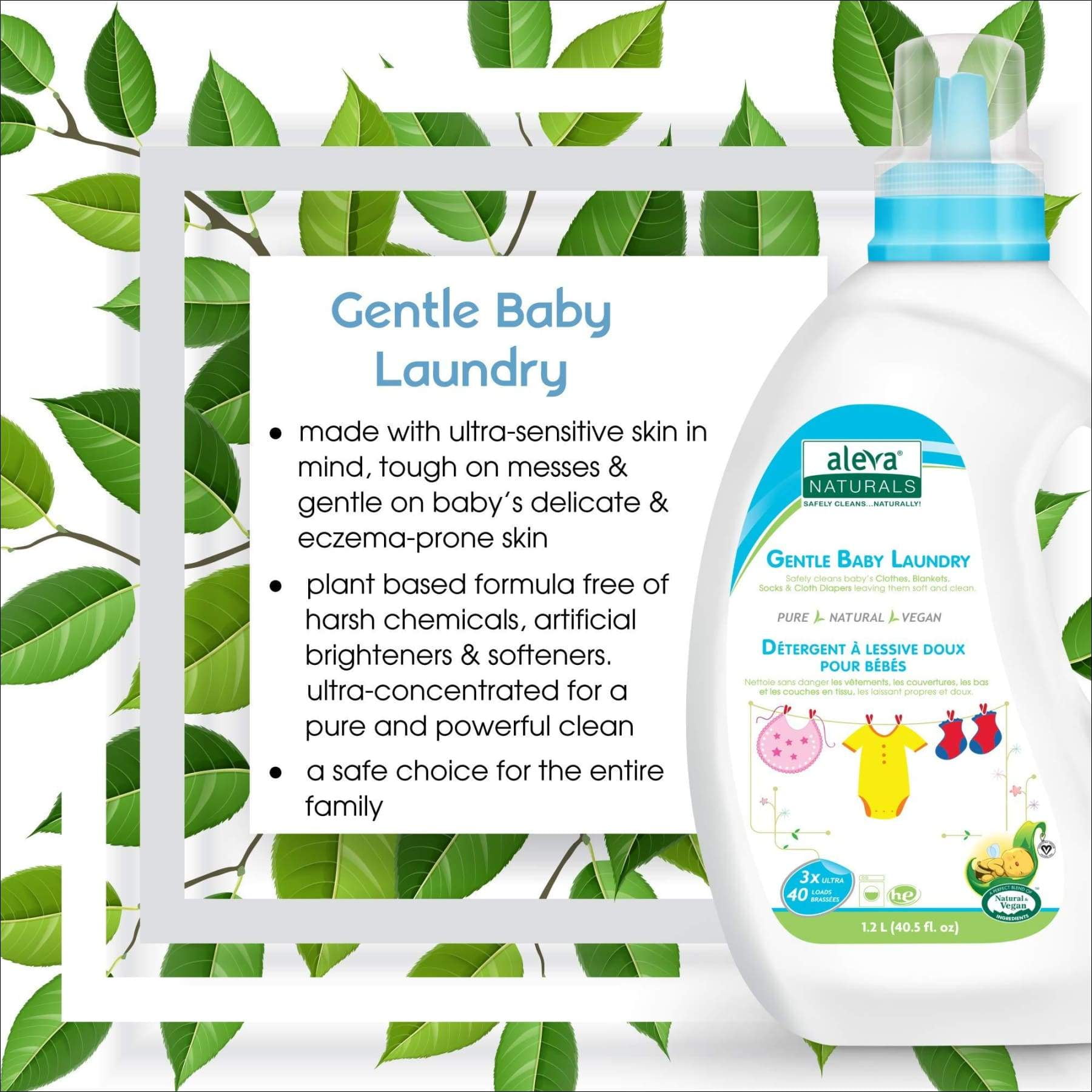 Aleva Naturals Gentle Baby Laundry the name says it all. The gentle blend of organic Aloe Vera juice chamomile oil natural tea tree oil and lavender essential oils gently cleanses soothes and leaves your babys skin feeling soft supple and. Fragrance Free Suitable for all fabrics and colours Can be used in hot or cold cycles 0 Toxins Hypoallergenic Certified Natural Certified Vegan Made in Canada.